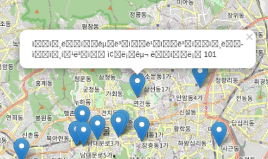 iframe으로 folium지도를 렌더링하게 되는데, UTF-8 인코딩을 못하고 있는 것이다.
