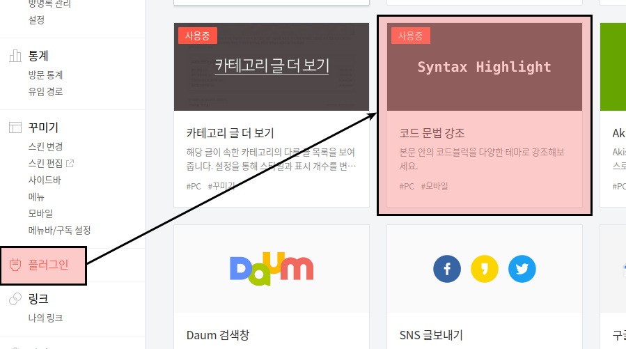 블로그관리-플러그인 에서 Syntax Highlight를 활성화하면 된다.
