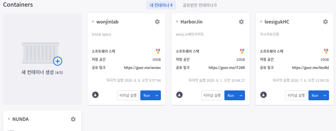 무료 계정은 최대 5개의 컨테이너, 1개의 동시실행권한이 주어지고, 사양이 낮다고는 하는데.. 아직까진 전혀 불편함 없이 사용하고 있다.