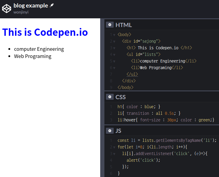 codePen은 정말로 간단한 웹 기능을 구상하고, 공유하고자 하는 경우에 특화된 서비스이다. 다양한 뷰를 제공하고, css와 js를 별도로 html안에 임베드할 필요도 없고, 딱 보여주고자 하는 그대로만 작성하면 된다.