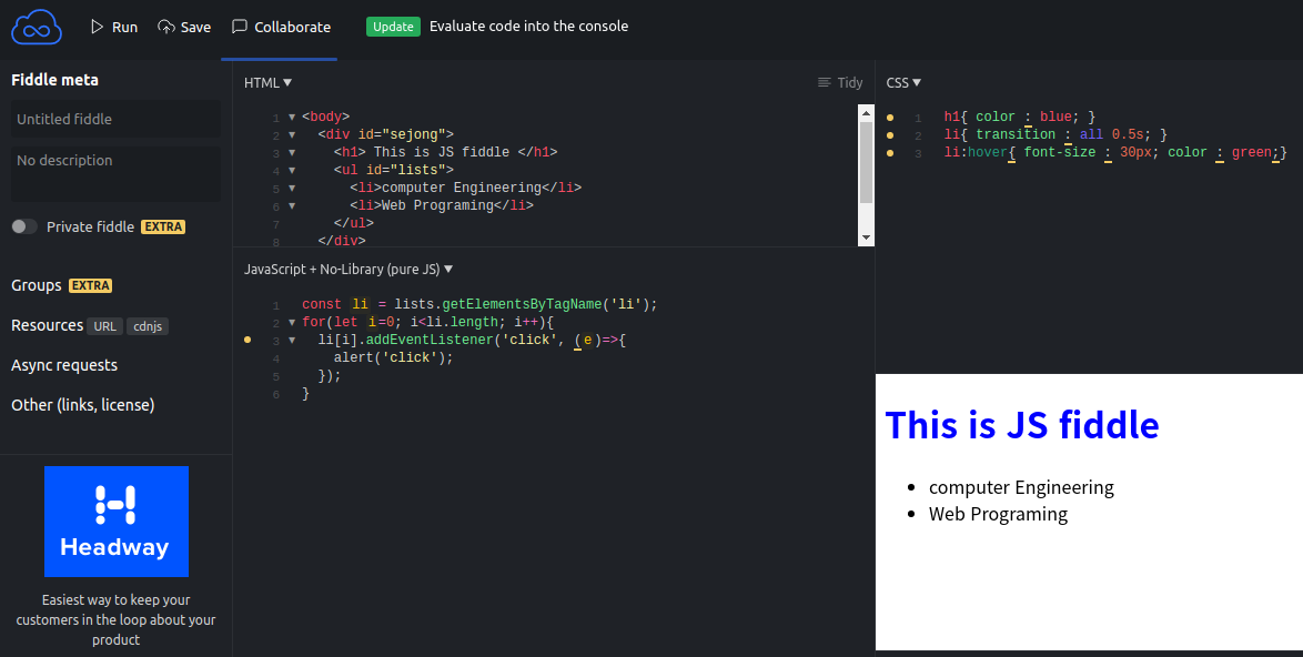 JSfiddle은 codePen과 비슷하면서도 다른 강점들을 갖고 있다. 우선 구글콜랩같은 동시 작업 기능을 제공하고, 외부 파일을 가져와 사용할 수 있는 메뉴를 제공한다. 또, 각 문서들의 오른쪽상단 'Tidy'버튼을 눌러 자동 정렬을 할 수도 있다.