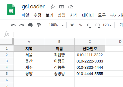 먼저 구글시트에 위와 같이 데이터를 입력한다. 프로그램에서 이용하기 쉬우려면 1행은 일종의 '대표하는 이름'이 되어야 한다.