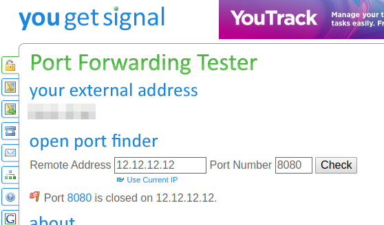가장 먼저, 사용하고자 하는 포트가 개방되어있는지 확인한다. yougetsignal에서 간단하게 확인할 수 있다. 사진에서는 닫혀있다(closed)고 표시되고 있다. 이 경우 간단하게 포트를 개방할 수 있다.