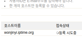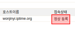 그러면 위와 같이 접속상태가 바뀌다가, 정상등록으로 표시된다. 예시의 경우 wonjinyi.iptime.org:8080으로 접속하면 12.12.12.12:8080 으로 접속한 것과 같다. ip가 99.99.99.99:8080 으로 바뀌더라도 등록한 도메인인만 알고있다면 아무 문제 없다.