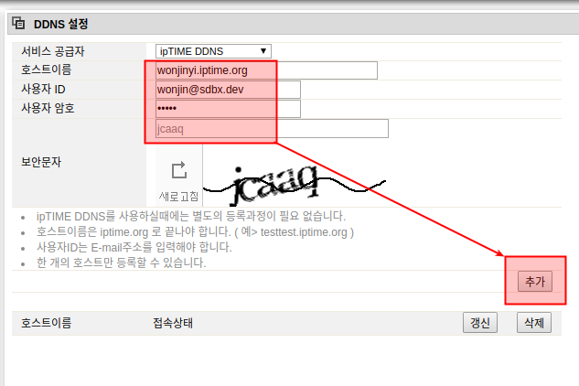 각각 '<원하는글자>.iptime.org', '이메일', '아무 비밀번호'를 입력하고 [추가]버튼을 누른다.