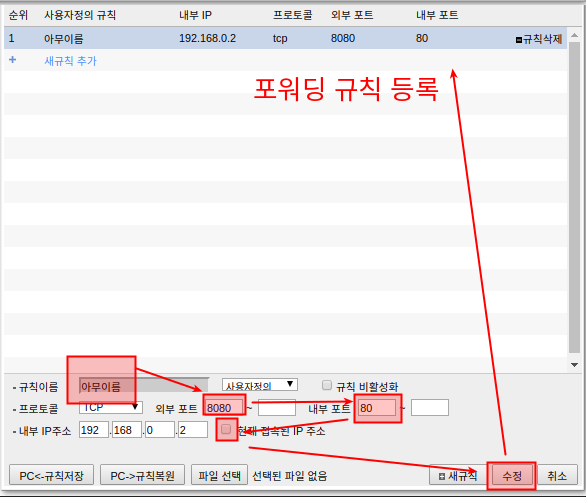 이제 외부ip의 포트와, 서버ip 포트를 임의로 1:1매칭 시켜주는 '포트 포워딩'만 남았다. 그냥 사진에서 나오듯 '규칙이름', '외부포트', '내부포트'(=서버 포트) 를 입력한 뒤, '현재 접속된 ip주소'에 체크해준뒤 '수정'을 누르면 목록에 추가된다.