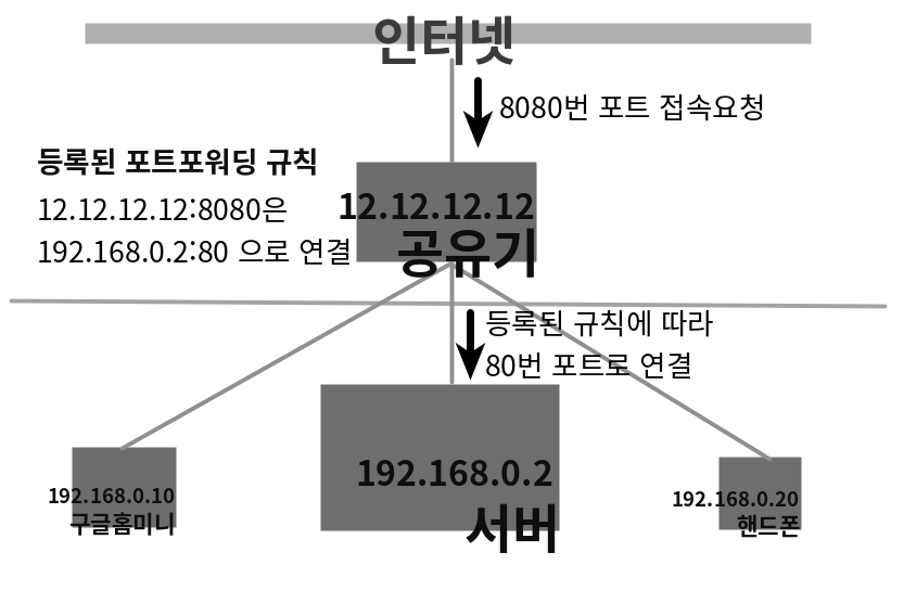 외부 망과 공유기 안의 사설망을 1:1로 대응시켜주는 과정이 필요하다. 위 그림과 같은 과정을 어떻게 설정하는지 간단하게 정리했다.