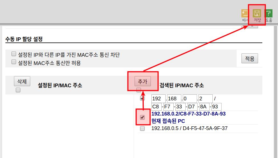 iptime기준 가장 아래 [수동 ip 할당 설정]에서 왼쪽 사진과 같은 절차를 거치면, 오른쪽 사진처럼 '설정된 IP/MAC 주소'에 서버컴퓨터의 IP와 MAC이 나타날 것이다. 여기까지 왔다면 서버컴퓨터에 특정 IP가 고정적으로 할당되도록 설정을 마쳤다.