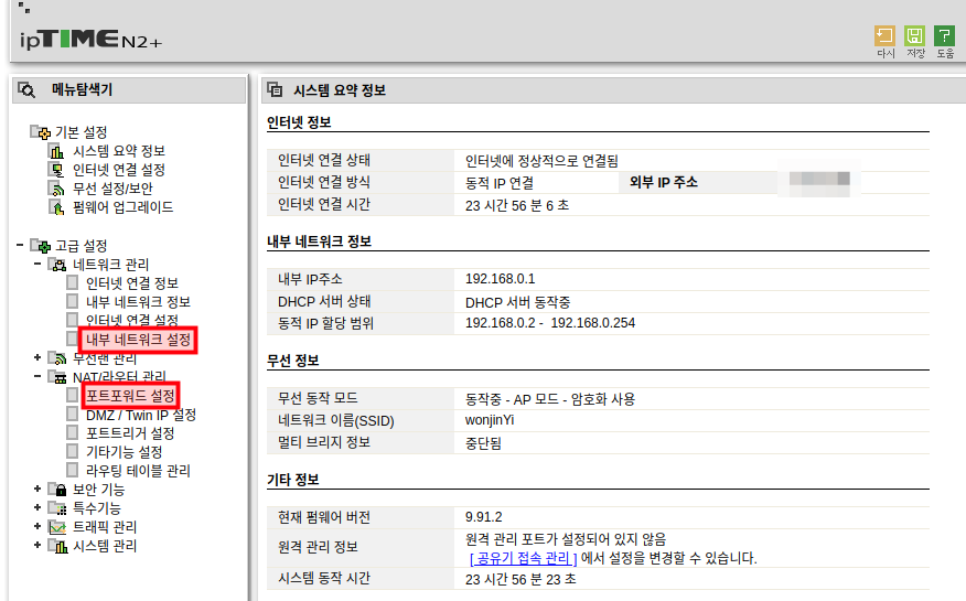 일반적으로 192.168.0.1로 접속하면 공유기 관리페이지를 이용할 수 있다. 이 관리페이지에서 왼쪽에 빨갛게 표시된 '내부 네트워크 설정'과 '포트포워드 설정' 두 가지에서 간단한 설정만 해주면 모든 과정이 끝이 난다. 먼저, '내부 네트워크 설정'을 살펴보자.