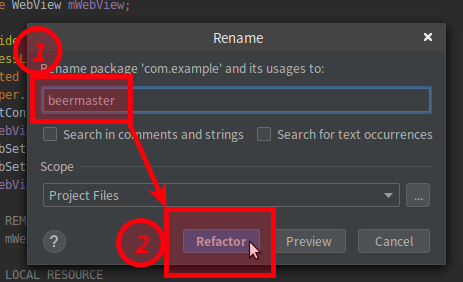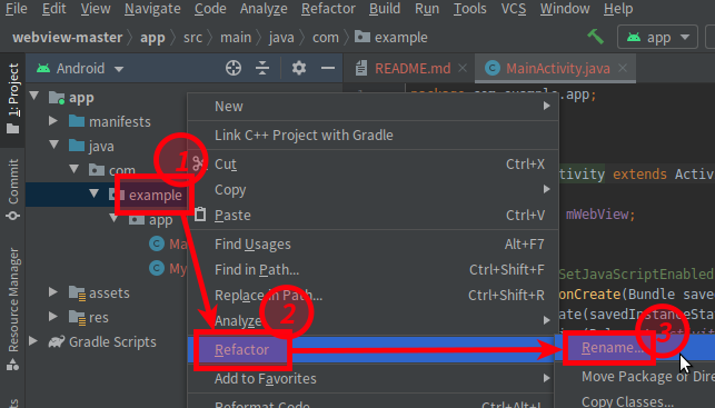 왼쪽 사진처럼 [example 우클릭] - [Refactor] - [Rename]으로 창을 띄운다. 그 창에서 오른쪽사진처럼 example을 대체할 이름을 적어넣고, [Refactor]를 클릭하면 안드로이드 스튜디오가 열심히 패키지이름을 전부 바꿔준다.