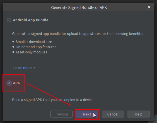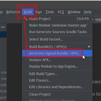 [Build]-[Generate Signed Bundle / APK]로 창을 열어준다. 이 포스트에서는 APK를 기준으로 설명할 것이므로, 아래의 APK에 체크하고 넘어간다.