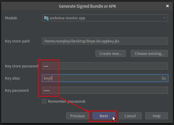 Key를 잘 만들었다면, 비밀번호와 Key alias를 입력하고 다음으로 넘어간다.