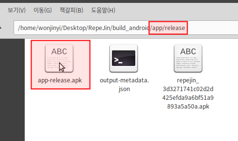뽑힌 Apk가 있는 위치는 프로젝트 폴더 아래의 app/release에 'app-release.apk'라는 이름으로 있다. 이게 이걸 핸드폰에 옮겨서 설치해보면 된다. 에뮬레이터로 돌릴 수도 있지만, 여기에 대한 설명은 굳이 여기에 적지 않는다.
