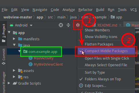 왼쪽 사진의 [톱니바퀴]-[Compact Middle Packages 체크 해제] 과정을 수행한다. 그러면 묶여있던 com.example.app이 오른쪽 사진처럼 3단계의 디렉토리로 풀려보이게 된다.