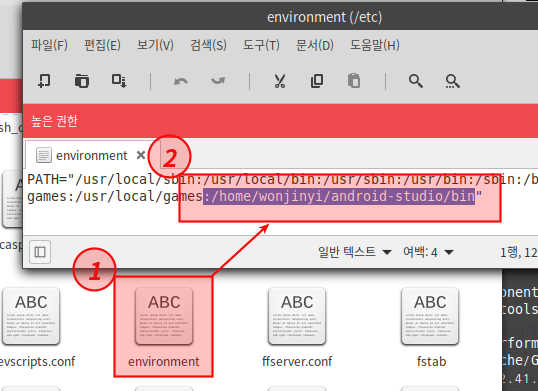 [environment]를 켜고, bin의 경로를 PATH문자열의 맨 끝에 추가해준다. 추가하는 내용의 앞에 :를 붙여 앞내용과 구분해줘야한다. 글쓰는 본인의 설치경로는 /home/wonjinyi/android-studio/bin이다. 이후 터미널을 재실행하면 어디에서나 studio.sh 만 입력하여 안드로이드 스튜디오를 실행할 수 있다.