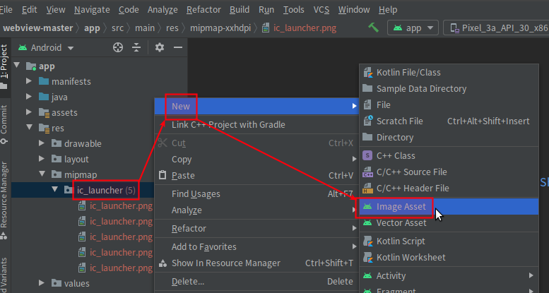 [ic_launcher 우클릭] - [New] - [Image Asset]을 눌러 설정창을 띄운다