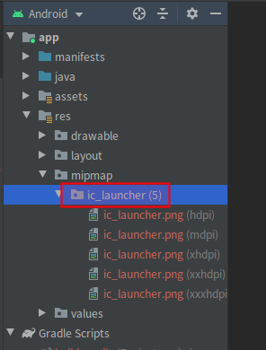오른쪽 사진에 보이는 [app]-[res]-[mipmap]-[ic_launcher]안에 아이콘을 집어넣어줄 것이다.