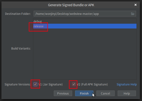 Build Variants는 release를 선택하고, Signature Versions은 V1, V2 둘 다 체크한다. 개발과정에서 V2만 체크를 한 적이 있는데, 구글플레이에 올라가지 않는 현상을 겪었다.