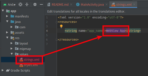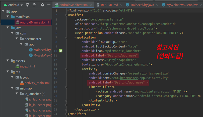 [app]-[res]-[values]-[strings.xml] 파일 안에서 WebView App부분을 원하는 이름으로 바꾸어주면 된다.