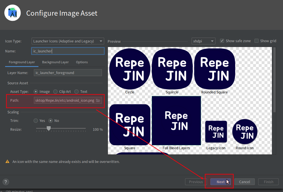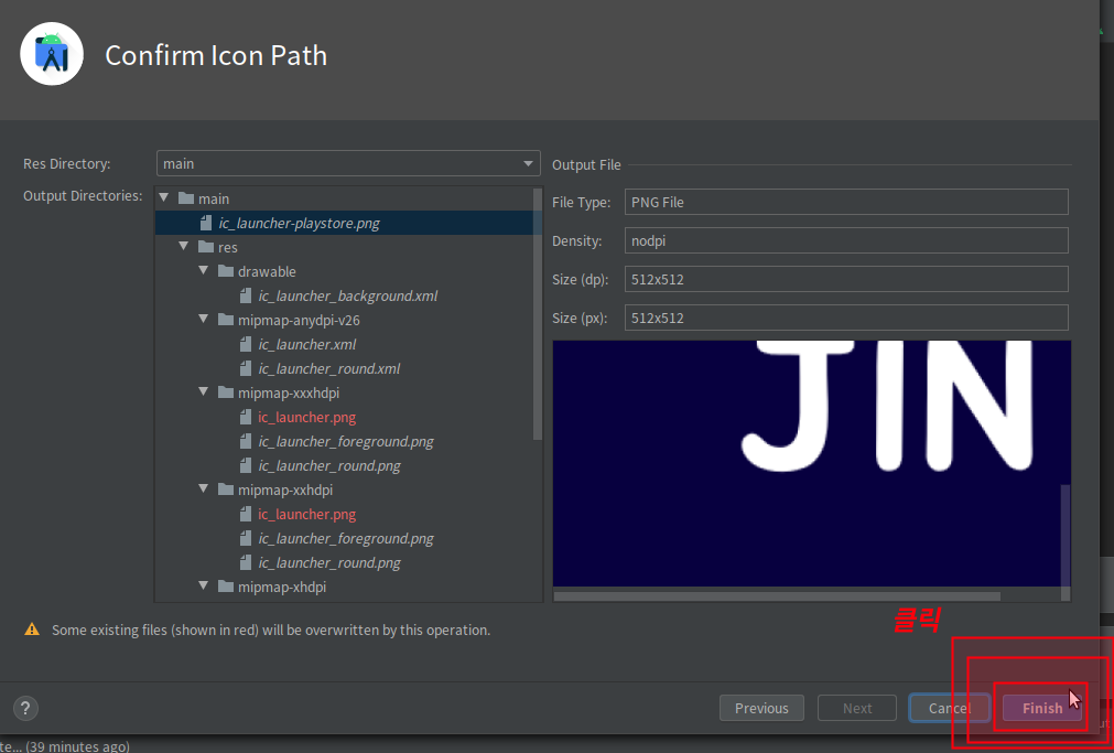다른 것은 건들필요 없고, [Path]에서 준비해둔 512x512px 이미지를 불러온뒤 [Next]-[Finish]로 설정창을 닫는다.