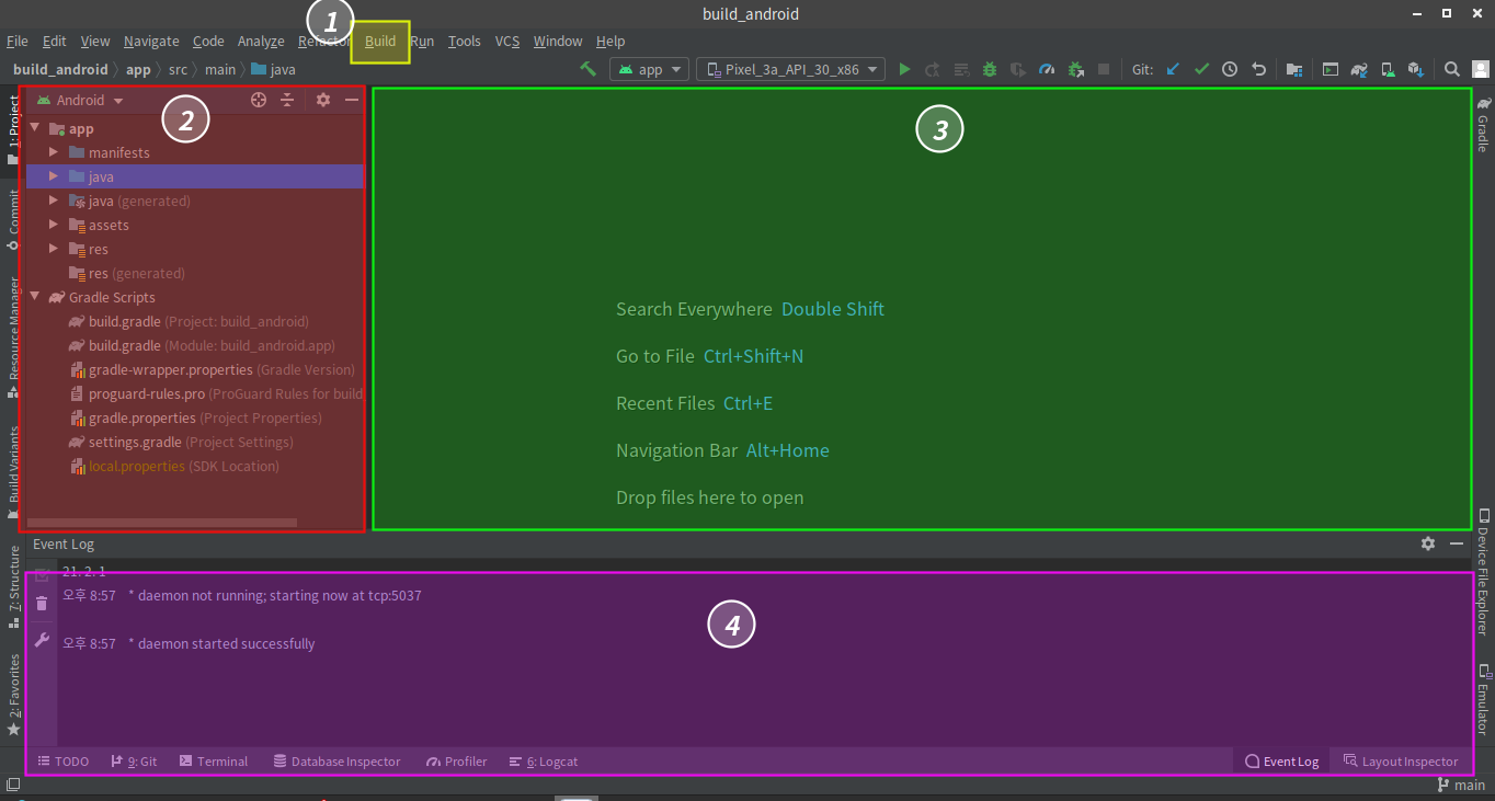 4. 보라 : 뭐 많이 표시해주는 공간 : 안드로이드에 빌드 시켜놓으면, 지금 뭐하고있는지 여기서 보여준다.