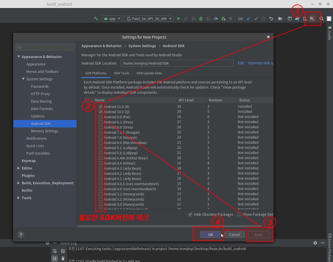 이건 그냥 필요한 버전의 SDK를 깔아주면 된다. 저 오류의 경우 'android-29'를 못찾는다고 했으니, 사진에서 API Level이 29인 'Android 10.0 (Q)'를 깔면 된다.